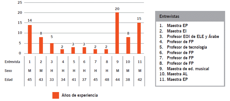 En la gráfica 1 se muestran los participantes de las entrevistas realizadas: docentes pertenecientes a diferentes etapas educativas, cinco mujeres y seis hombres, entre 33 y 48 años de edad, quienes cuentan -en la mitad de los casos- con una experiencia docente mayor de ocho años.