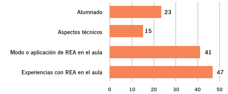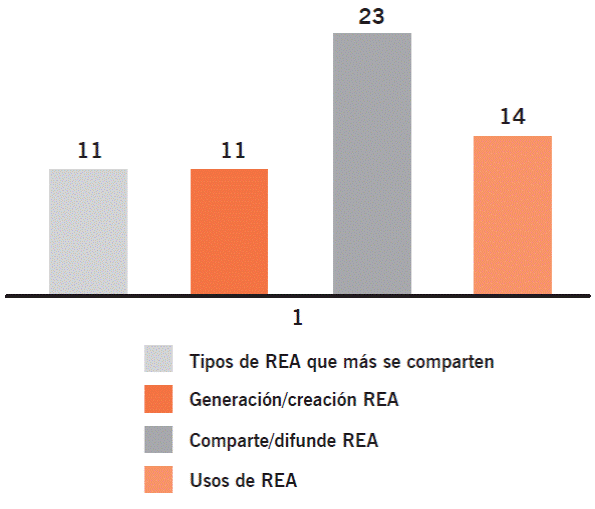 Compartir y dar a conocer REA: se preguntó a los docentes si difundían en redes sociales los REA. Las respuestas fueron dispares, ya que hay docentes que sí comparten REA en las redes sociales, mientras que otros no, debido a que el uso de su perfil es personal, e incluso hubo docentes que no contaban con redes sociales.