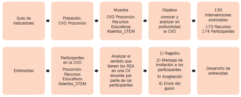 Para este estudio se empleó una metodología de investigación de corte cualitativo con el propósito de conocer y analizar el uso de los REA en una CVD. Se describen el significado, los usos y las potencialidades que tienen los docentes que participan en la comunidad sobre los recursos educativos de libre acceso, mientras se busca comprender para qué y cómo usan los docentes los REA. Con este fin, se ha seleccionado la comunidad virtual Procomún Recursos Educativos Abiertos_STEM, que forma parte del Espacio Procomún Educativo, una iniciativa del Ministerio de Educación en la que se sustenta el Proyecto Agrega.8