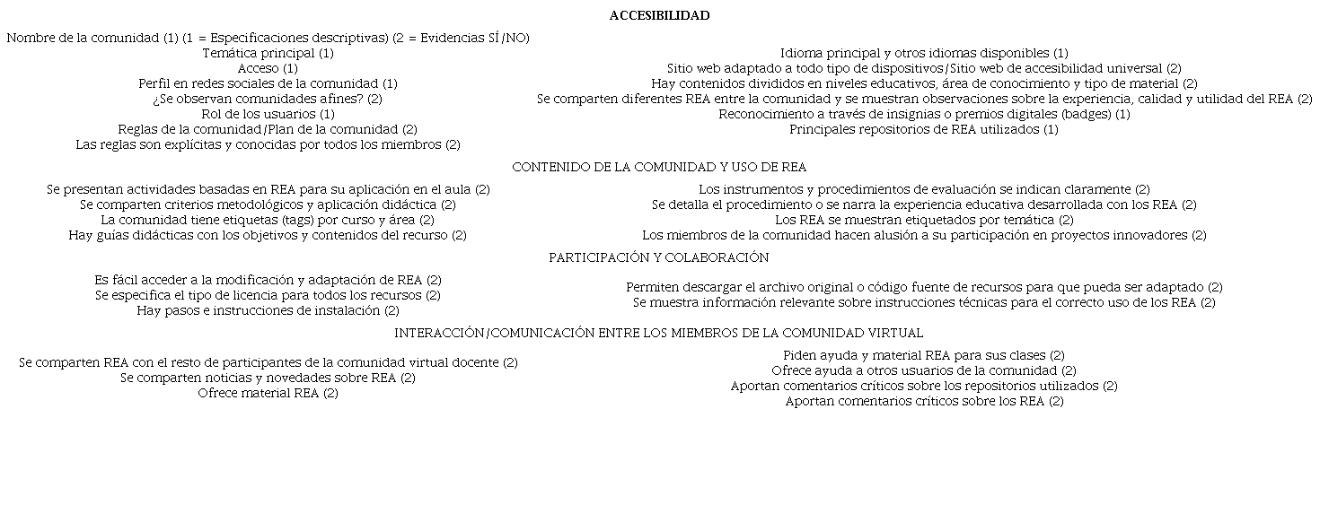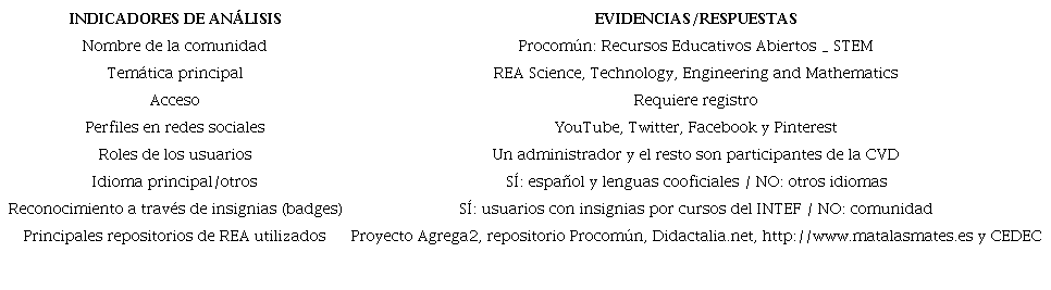 El análisis de la CVD Procomún, y de los REA que ofrece, se desarrolló a partir de considerar la guía de indicadores elaborada ad hoc. La evaluación de las CVD, así como de sus REA, se realizó conforme al grado de presencia/ausencia que presentaron estos indicadores de análisis. Asimismo, se incorporaron campos abiertos con la finalidad de recabar información de tipo cualitativo (ver tabla 2).