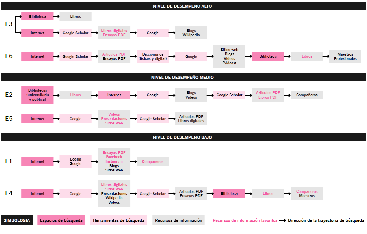 Para los estudiantes con nivel de desempeño alto el proceso de búsqueda implica analizar y comprender la información, por lo que aplican criterios de selección como la especificidad, el ajuste temático y la fiabilidad, aspectos que dirigen su proceso de búsqueda hacia recursos principalmente académicos, por ejemplo, libros, artículos y ensayos: