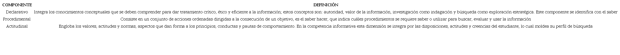 En coherencia con la perspectiva del aprendizaje estratégico y con base en los aportes de Zabala y Arnau (2014), Perrenoud (2011), Tardif (2008) y Monereo (2005), en este proyecto se entiende por competencia informativa un proceso reflexivo y estratégico que implica: a) el análisis de una situación-problema de aprendizaje sobre búsqueda y uso de información, b) la comprensión de sus alcances y c) la selección del esquema de actuación más apropiado -de entre aquellos de los que se dispone- para enfrentar estratégicamente las demandas de búsqueda, evaluación y uso de información, con base en su comprensión. El esquema de actuación moviliza de forma interrelacionada los componentes actitudinal, procedimental y declarativo de la competencia, lo que da lugar a intervenciones eficaces (ver tabla 1).
