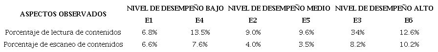 Como se muestra en la tabla 3, en la búsqueda y selección de contenidos todos los estudiantes aplican la estrategia de lectura por escaneo, la cual consiste en revisar de manera rápida el contenido del recurso consultado. Durante esta revisión, los titulares, palabras o enunciados en negritas se consideran puntos de anclaje para detener el escaneo y realizar una lectura detallada del contenido. En contraste, el porcentaje de lectura de contenidos es mayor en el caso de los estudiantes con nivel de desempeño alto; con esta estrategia se tiene la intención de comprender el contenido para después realizar paráfrasis o argumentaciones.