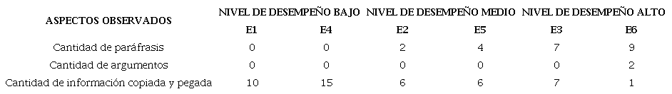 Los porcentajes de lectura de contenido son coherentes con el tipo de procesamiento de la información; de esta manera -como se identificó en las entrevistas-, en el nivel de desempeño alto es clara la intención de realizar paráfrasis y argumentos, mientras que en el nivel de desempeño bajo el esfuerzo se concentra en copiar y pegar la información (ver tabla 4). En lo que respecta al nivel de desempeño medio, la diferencia con el nivel inferior es que los estudiantes incorporan algunas paráfrasis, aunque aún predomina la recolección de piezas de información. Cabe distinguir que los estudiantes de nivel de desempeño alto también copian y pegan, pero en general hay intención por esforzarse en comprender los contenidos. Es posible que la prevalencia de la práctica de copiar y pegar en todos los niveles se deba al tipo de actividad solicitada, pues la elaboración de diapositivas implica principalmente la síntesis de información.