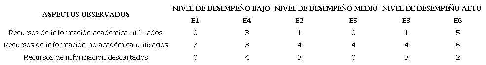 Con la intención de contrastar el tipo de recursos de información entre los niveles de desempeño, la tabla 5 permite visualizar la cantidad de recursos de información académicos y no académicos utilizados, así como la cantidad de recursos descartados. Lo que se identificó es coherente con lo declarado en las entrevistas: los estudiantes del nivel de desempeño alto tienden a discriminar recursos de información, lo cual se asocia a un proceso más analítico en la revisión de contenidos, mientras que los estudiantes del nivel bajo suelen confiar en los primeros resultados que encuentran, por lo que su proceso de discriminación es menor.