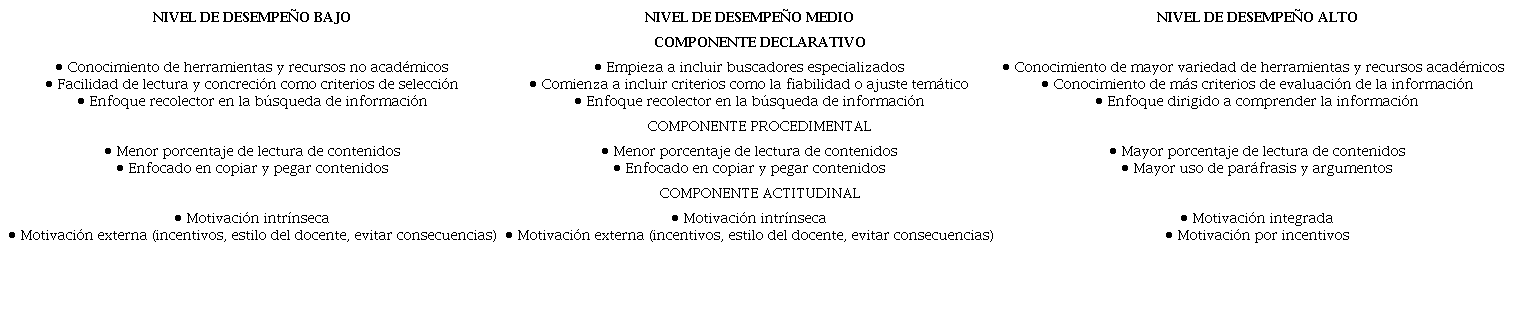 A partir de los resultados se identificaron cambios cuantitativos y cualitativos entre los niveles de desempeño de la competencia informativa (ver tabla 6). Estos muestran que el proceso de aprendizaje de esta competencia es diferente entre estudiantes del mismo semestre. Respecto a la interrelación entre los componentes, se encontró que la motivación cumple una función importante en la disposición de los estudiantes para implicarse en el proceso de búsqueda y en el tratamiento de la información; lo declarado por los estudiantes en las entrevistas sugiere que el tipo de motivación determina la cantidad y la variedad de herramientas y recursos de información a utilizar para el logro de sus metas académicas.