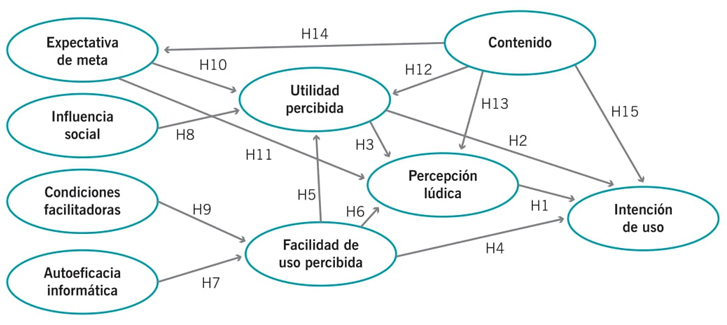 Resulta interesante que el constructo de contenido, empleado por primera vez en este modelo, no mostró un impacto directo en la intención de uso, en contraste con lo sugerido en la hipótesis inicial. También se confirmó únicamente una hipótesis de las propuestas en relación con el contenido: tiene un efecto directo sobre la utilidad percibida, la percepción lúdica y la expectativa de meta, lo que indica una influencia indirecta en la intención de uso. En cuanto a la expectativa de meta, que también se utilizó por primera vez en este modelo, se demostró que los estudiantes encuentran una EBC lúdica cuando tienen buenas expectativas del sistema. Asimismo, el efecto positivo de la influencia social en la utilidad percibida proporcionada por TAM2 fue apoyado por este modelo.