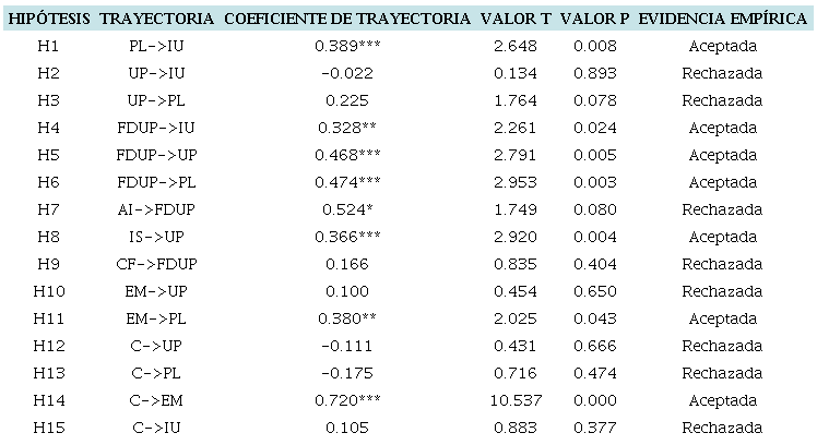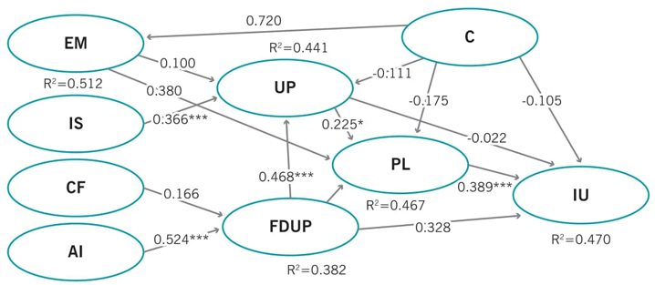 Para examinar el modelo estructural es esencial investigar la significancia estadística de las relaciones en el modelo (valor t) de las hipótesis de investigación (las estimaciones de la trayectoria) a un nivel de 0,05, así como el coeficiente de determinación (R2) para las variables endógenas de la investigación. El modelo manifiesta 47% de variación en la intención de uso. Los efectos totales de PL (0.389), FDUP (0.543) y C (0.141) son importantes para la explicación de la intención de uso. Además, EM (0.403), AI (0.303), FDUP (0.579) y UP (0.225) representan 47% de la varianza en la percepción lúdica. Por otro lado, FDUP (0.468), AI (0.245), IS (0.366) y EM (0.100) explican 44% de la varianza en la utilidad percibida. AI (0.524) y CF (0.166) representan 38% de la variación en la facilidad de uso percibida. Finalmente, el contenido (0.72) explica 51% de la variación en la expectativa de meta. En la figura 2 y la tabla 4 se resumen los resultados de las hipótesis.