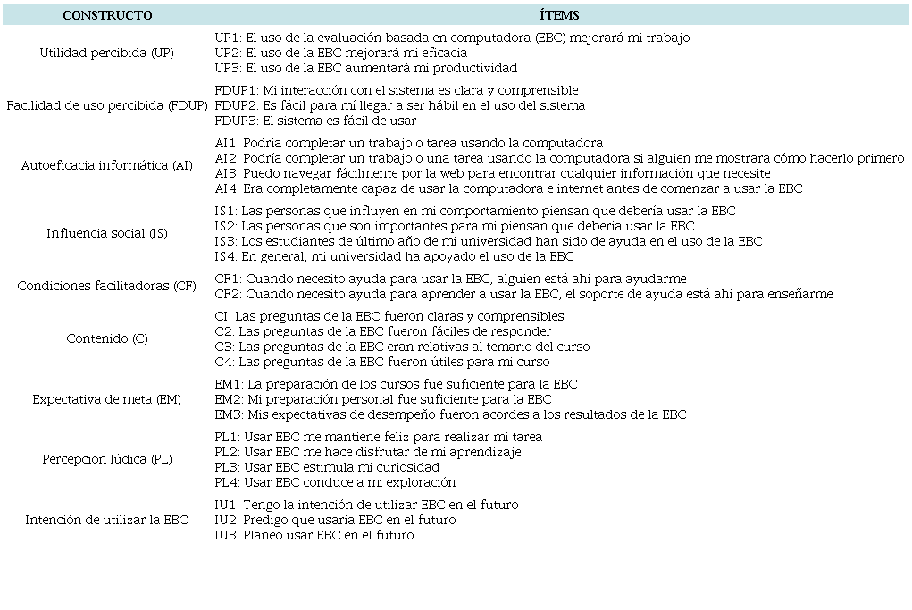 Cabe destacar que al revisar la literatura no se encontraron instrumentos con reportes de confiabilidad y validez para medir la aceptación y la intención de uso por parte de estudiantes universitarios mexicanos de un sistema de evaluación basada en computadora (EBC).
