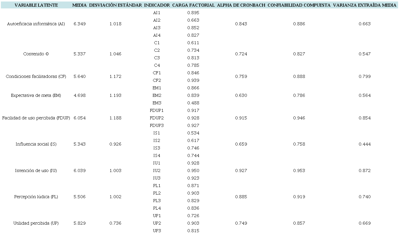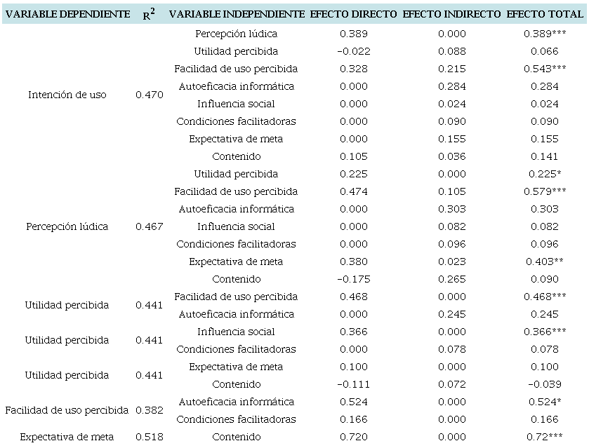 Los resultados del estudio indican que la percepción lúdica impacta directamente en la intención de uso. Por otro lado, se identificó que la utilidad percibida, la facilidad de uso percibida, la autoeficacia informática, la influencia social, las condiciones facilitadoras, la expectativa de meta y el contenido tienen impactos indirectos en la intención de uso (ver tabla 5).