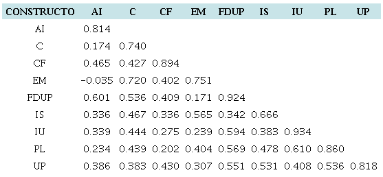 Para evaluar la validez discriminante se aplicó el criterio de Fornell y Larcker (1981), considerada una de las medidas más relevantes en este ámbito. En este método se evalúa la raíz cuadrada de la varianza extraída media (AVE) para cada variable latente. La pauta recomendada es que la raíz cuadrada del AVE para cada variable latente debe ser mayor que su correlación con cualquier otra variable latente (Garson, 2016). El texto en negrita en la diagonal de la tabla 3 representa la raíz cuadrada del AVE de cada una de las variables latentes. Los resultados muestran que, en todas las variables latentes, la raíz cuadrada del AVE es mayor que las correlaciones con otras variables (los números debajo de la diagonal), lo que confirma que la validez discriminante está adecuadamente establecida en el estudio.