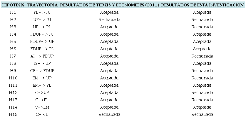 Se puede argumentar que todavía existen brechas significativas a pesar del esfuerzo y la atención sustanciales que se han dedicado a la investigación sobre la adopción de las TIC. El trabajo de Terzis y Economides (2011) representa uno de los pocos estudios enfocados en desarrollar un modelo para comprender la adopción de las evaluaciones electrónicas. En este se identifican y demuestran los constructos clave que influyen en la disposición de los estudiantes para utilizar EBC, aportando una perspectiva significativa en el campo de la evaluación electrónica. La tabla 6 resume los resultados de la presente investigación y de los autores antes mencionados, muestra las 15 hipótesis y si fueron o no respaldadas por el modelo. Los datos obtenidos de este estudio concluyen que los estudiantes tienen mayor probabilidad de utilizar un sistema si este es lúdico, lo que confirma los hallazgos de estudios previos. Igualmente, es más probable que una EBC sea percibida como lúdica cuando es fácil de usar.
