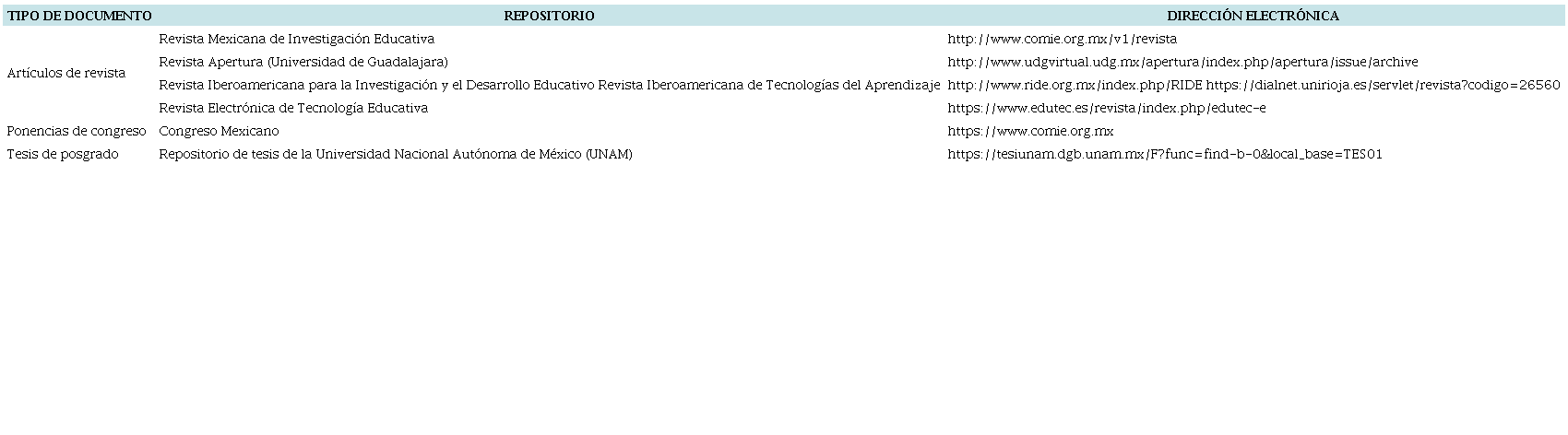 Los criterios de inclusión de la información fueron los utilizados por Olivares et al. (2016): 1) que los estudios estuvieran escritos en español o inglés, 2) que las fuentes fueran confiables y reconocidas a nivel nacional e internacional, 3) que pertenecieran a revistas indexadas, 4) que las investigaciones aceptadas fueran empíricas, teóricas y en revisión y 5) que las investigaciones hayan sido publicadas en el período 2011-2023. En cuanto a las bases de datos estudiadas, se consideraron los repositorios de revistas mexicanas de investigación educativa, memorias de congresos realizados en México y tesis de grado de universidades mexicanas (ver tabla 1).