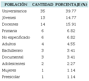Se obtuvieron 88 investigaciones correspondientes al período de 2011-2023 (47 ponencias, 33 artículos de revista y ocho tesis de grado). Un aspecto notable fue la población a la que estuvieron dirigidos los estudios, ya que hubo mayor interés por analizar la ciudadanía digital a nivel universitario, debido a que del total, 35 estudios contemplaron esta población (ver tabla 2).