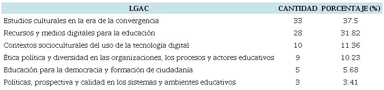 Los trabajos revisados se organizaron por LGAC. Para establecer un control sobre las áreas de investigación, se tomaron en cuenta las LGAC de la Universidad Veracruzana, del Instituto Tecnológico de Sonora, de la Universidad Autónoma de Querétaro, de la Universidad Autónoma del Estado de Morelos y del Tecnológico de Monterrey. Asimismo, se identificaron seis LGAC: 1) Recursos y medios digitales para la educación, 2) Políticas, prospectiva y calidad en los sistemas y ambientes educativos, 3) Educación para la democracia y formación de ciudadanía, 4) Estudios culturales en la era de la convergencia, 5) Ética, política y diversidad en las organizaciones los procesos y actores educativos, y 6) Contextos socioculturales del uso de la tecnología digital.
