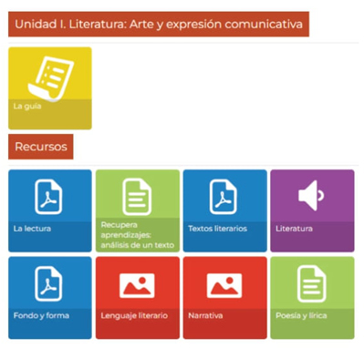 Considerando estas características se llevó a cabo la investigación. De inicio se detectó que los recursos educativos que se presentan en la plataforma de Prepa en Línea SEP tienen un contenido temático básico, escaso y en algunos casos incompleto, esto ocasiona que los alumnos tengan dificultad para comprender a profundidad los temas abordados en cada unidad de estudio. Por ejemplo, en el Módulo 4 de la plataforma, se presentan ocho recursos para tratar los temas que conforman la Unidad I. Literatura: arte y expresión comunicativa (ver figura 2), pero dentro de estos no hay una explicación detallada.