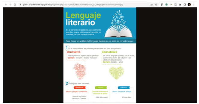 Esta situación puede notarse en la infografía de la figura 3, en donde de manera general se menciona el significado de los conceptos: lenguaje literario, connotativo y denotativo. De igual forma, se presenta una breve información sobre las funciones del lenguaje, pero solo se enuncian tres de las seis que deberían estar (falta incluir: metalingüística, fática y poética).