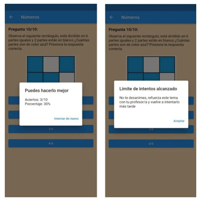Con respecto a los cuestionarios y resultados se respondieron los ejercicios de números con tres respuestas correctas de diez, para constatar que en la ventana emergente se mostrara el mensaje: “Puedes hacerlo mejor”, así como el número de aciertos y el porcentaje correspondiente. Además, se probó la cantidad de intentos permitidos (un total de tres) y se verificó que el mensaje de la ventana emergente fuera: “Limite de intentos alcanzados. No te desanimes, refuerza este tema con tu profesor/a y vuelve a intentarlo más tarde” (ver figura 2).