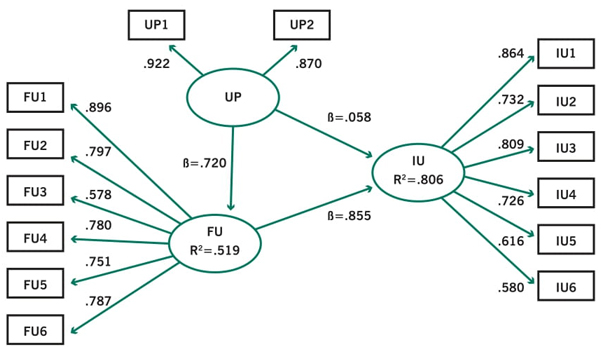 Respecto a la FU, Davis (1989) se refiere al grado en que los individuos creen que una tecnología les resultará fácil de utilizar. La FU desempeña el mismo papel que la UP al influir en el uso o rechazo de una tecnología. Se ha señalado que la FU debe combinarse con la UP para influir en la IU, ya que es más probable que se adopte una tecnología si es fácil de usar y no se requiere esfuerzo. Los estudios de Luik y Taimalu (2021) y Pappas et al. (2017) demostraron que la FU tiene un impacto favorable significativo en la UP, lo que a su vez permite determinar la IU.