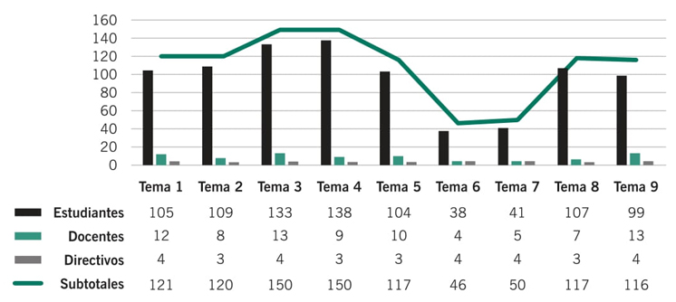 En relación con el tema 9, “Impacto en el proceso educativo”, el personal directivo percibió el sitio web como una herramienta útil para fortalecer el proceso educativo, facilitar el acceso a la información y promover la colaboración entre docentes y estudiantes, quienes también valoraron positivamente el sitio web como una herramienta valiosa para el aprendizaje y la enseñanza. La frecuencia absoluta con la que los actores educativos se manifestaron en cada tema se puede ver en la gráfica.