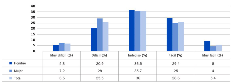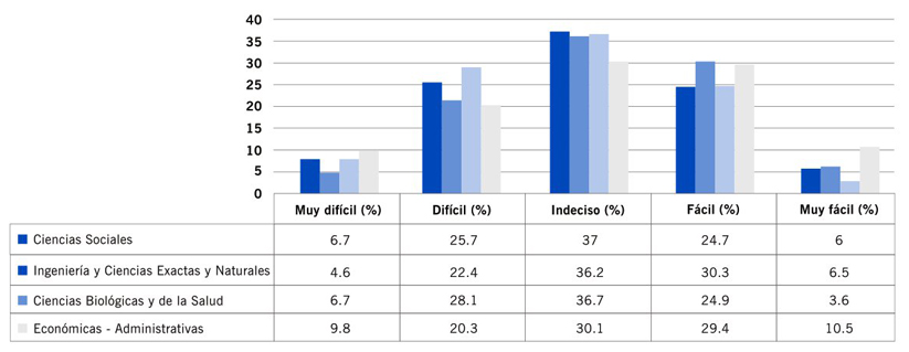 Al analizar la pregunta por programa educativo se encontraron diferencias significativas entre los grupos (χ2 (12) = 27.512; p = .007). Estas, según la prueba de Bonferroni, se identificaron únicamente en la categoría “muy fácil” en los programas de Económicas-Administrativas (10.5%) y Ciencias Biológicas y de la Salud (3.6%). De manera descriptiva, y excluyendo la opción “indeciso”, se destaca que la respuesta más frecuente para los estudiantes del programa de Ciencias Sociales fue la opción “difícil” (25.7%), al igual que los de Ciencias Biológicas y de la Salud (28.1%). En cambio, en los estudiantes del programa de Ingeniería y Ciencias Exactas y los de Económicas-Administrativas predominó la opción “fácil” con 30.3% y 29.4% respectivamente (ver gráfica 3).