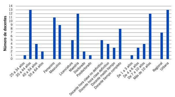 La muestra se integró por 20 docentes, quienes en el desarrollo del taller proporcionaron la información de la mayoría de las actividades asignadas; estos participaron como colaboradores de acuerdo con la propuesta de Creswell (2012). El rango de edad abarcó de los 25 a los 64 años, y se dividieron en cuatro rangos de diez años cada uno. En relación con el nivel de estudios, se observó desde el nivel licenciatura hasta el posdoctorado, destacando la presencia de maestrías. La situación contractual varió desde docentes con horas clase temporales hasta contratos de tiempo completo, siendo este último el rasgo predominante. Este dato refleja una tendencia en la experiencia docente, con la mayoría de los participantes acumulando más de diez años de experiencia frente a grupos (ver gráfica 1).