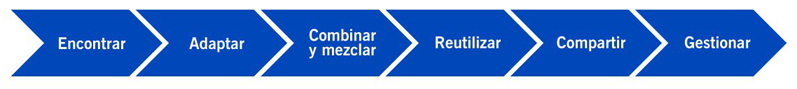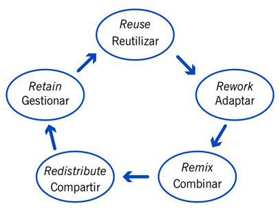 Casi todos los modelos que describen las fases de los REA coinciden en que deben ser encontrados, adaptados y utilizados de diversas formas con el fin de ser compartidos (Beaven, 2018). En la figura 1 se muestra el esquema del modelo de Wiley (2014) fundamentado en las licencias abiertas CC, el cual considera que se lleva a cabo un conjunto de prácticas clave, definidas como las 5R, por sus siglas en inglés.