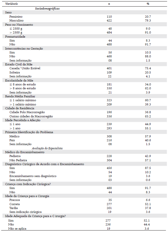 Assim, os dados deste estudo referem-se a uma amostra de 532 crianças, sendo que 79.3% eram do sexo masculino. Em relação à cidade de residência, 63.2% são de outras cidades da macrorregião e em 57.9% os médicos das unidades básicas de saúde foram os primeiros a perceber a afecção. O Quadro 1 apresenta as principais características das crianças avaliadas.