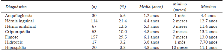 A maior parte das afecções com possibilidade de correção ambulatorial acometem em maior proporção ou exclusivamente o sexo masculino. Portanto, a prevalência de meninos é maior nos trabalhos envolvendo patologias pediátricas, dados confirmados neste trabalho (Al-Jazaeri et al., 2017). Neste estudo, com exceção da hérnia umbilical em que a média da idade está dentro do preconizado pela literatura (Zens et al., 2017), todas as outras afecções apresentaram média de idade inadequada para correção cirúrgica. Além disso, 10.2% (54/532) das crianças avaliadas não tinham indicação cirúrgica ou estavam em uma idade precoce para correção, contribuindo para o aumento da fila de espera da especialidade e o atraso de avaliações de crianças que necessitam de tratamento cirúrgico.