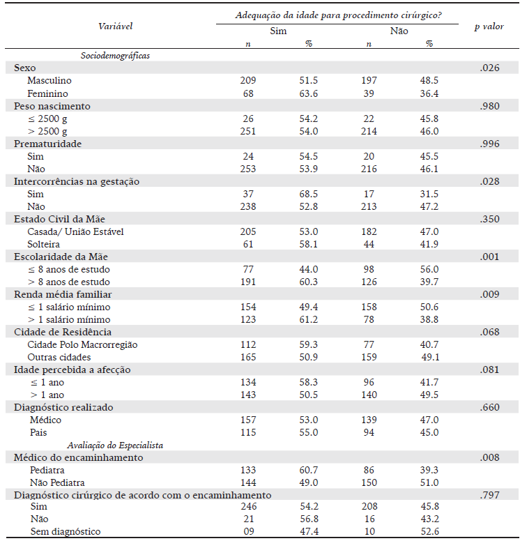 O Quadro 3 apresenta os resultados das análises bivariadas entre a idade adequada para o procedimento cirúrgico durante a consulta com especialista e características do grupo estudado.