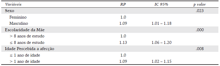 O Quadro 4 apresenta o modelo final a partir da regressão de Poisson para avaliar os principais determinantes na inadequação da idade cirúrgica no momento da consulta com o especialista.