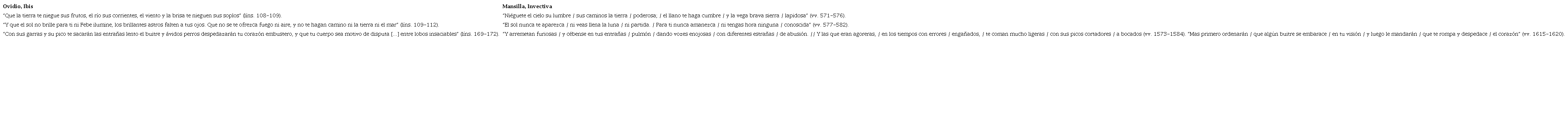 Sobre las semejanzas entre los dos textos, cabe destacar un aspecto interesante: en ambos casos los autores se muestran reacios a desvelar el nombre del invectivado. En Ovidio nunca se llega a nombrar (“Callaré su nombre” [lín. 9]; “Y puesto que no desvelo aún quién eres a los que quieren saberlo” [lín. 61]),22 mientras que en Mansilla, pese a las reticencias (“Que no te daré nombre” [v. 14]; ¡Oh, qué memoria tan flaca / que tuve en tener memoria / de tu nombre” [vv. 139-141]),23 “ se explicita en el título y en el prólogo que la invectiva se dirige contra Lutero y, además, en el v. 138 se hace referencia a los “lutheranos”.24 A continuación señalamos, a manera de ejemplo, algunas similitudes entre los dos textos, lo cual evidencia que, como explica Guarino Ortega, Mansilla conocía el Ibis de Ovidio y lo tuvo en cuenta al escribir su invectiva:25