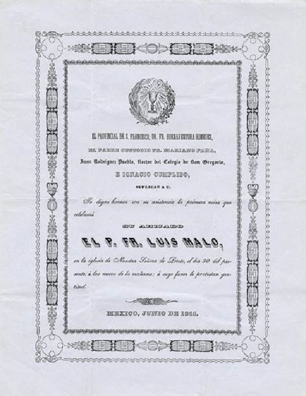 Los datos que se tienen de la trayectoria religiosa de fray Malo también son escasos. En una estadística de los franciscanos de 1885 se refiere que perteneció a la “provincia o colegio” de Pachuca.5 Entonces, es posible que antes de 1840 ingresara como novicio en la Orden de San Francisco. El 16 de enero de 1848 recibió la aprobación eclesiástica para obtener el diaconato y meses después, el 2 de junio, obtuvo la aprobación para recibir el presbiterado. Fue así como fray Luis Malo dio su primera misa en la parroquia de Nuestra Señora de Loreto de Ciudad de México el 30 de junio de 1848, a las 9 de la mañana. Los anfitriones fueron fray Buenaventura Homedes, provincial de San Francisco; fray Mariano Peña, “padre” custodio; Juan Rodríguez Puebla, rector del Colegio de San Gregorio; e Ignacio Cumplido, editor e impresor, tal como lo atestigua la invitación que el provincial y fray Malo enviaron a colegas y amigos (Figura 2).6
