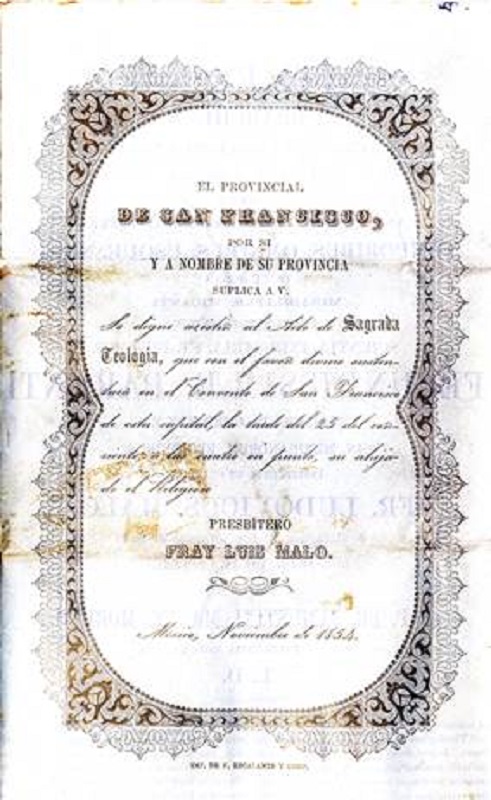 Algunos años después, el provincial fray José María Cruz extendió otra invitación para que familiares y amigos asistieran al examen de teología de fray Luis Malo, que se llevó a cabo en el Convento de San Francisco de Ciudad de México, a las 4:00 de la tarde del 25 de noviembre de 1854 (Figura 3).7