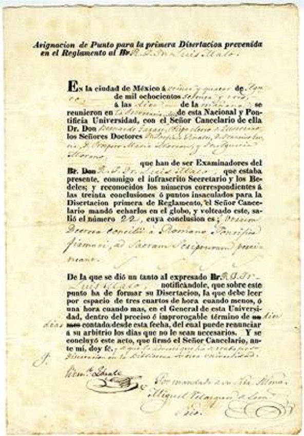 El 24 de agosto de 1863, en la Nacional y Pontificia Universidad -ante el doctor Bernardo Garate, obispo electo de Querétaro, fray Porfirio Rosales, Francisco García, Próspero María Marcón y fray Agustín Moreno- obtuvo la autorización para que en los próximos 10 días presentara su “primera Disertación” (Figura 4). Ello significó que fray Malo estuvo trabajando en su alocución en la biblioteca de la universidad. Fue el 9 de septiembre cuando presentó su examen para obtener el grado de licenciado en Teología, en el aula capitular del senado metropolitano.9