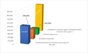 Mario Ramírez Rancaño hace un estudio mucho más exhaustivo acerca de la verdadera significación de este “exilio mexicano” poco mencionado por la historia, que sin duda fue no sólo el más numeroso, sino el más relevante en el ámbito político.35 Este investigador documenta cerca de medio millón de mexicanos exiliados, entre ellos unos 300 mil definitivos y el resto “temporales”, cifra sólo comparable -cuantitativamente hablando- al éxodo judeo-alemán de la Segunda Guerra Mundial36 (véanse las gráficas 1 y 2).