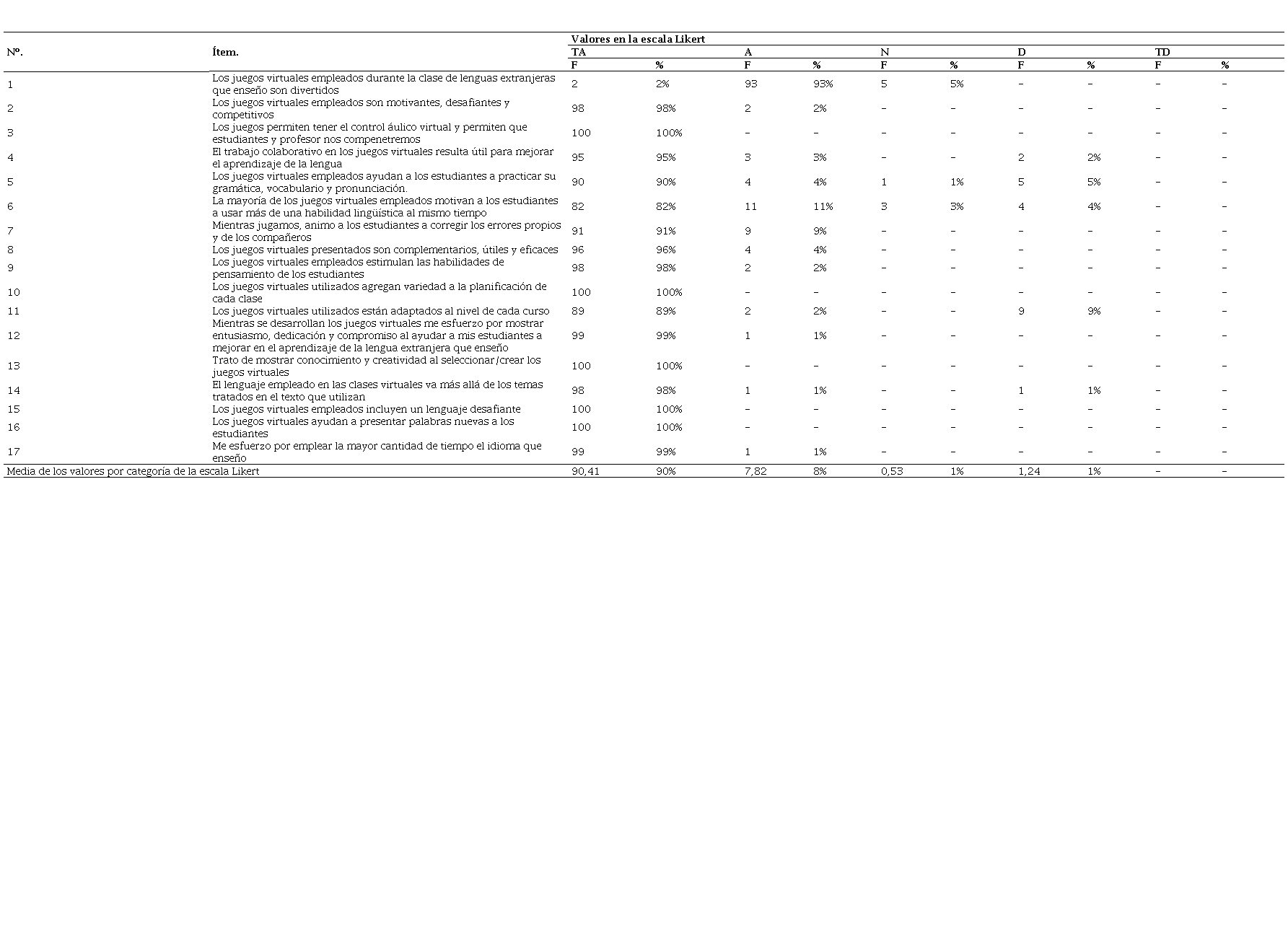 Cada una de las proposiciones fue presentada en una escala positiva, por lo que a mayor escogencia en la opción Totalmente de acuerdo significa mayor percepción positiva hacia la premisa presentada en la proposición, por el contrario, una mayor escogencia en la alternativa Totalmente en desacuerdo se traduce como un mayor rechazo hacia la información que se presenta en el ítem. La media general para los ítems con una selección de Totalmente de acuerdo fue de 90,41 puntos lo que representa que el 90% de los participantes declaran que la gamificación es una estrategia educativa altamente efectiva como estrategia para la enseñanza de lenguas extranjeras en entornos virtuales del aprendizaje.