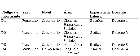Los entrevistados fueron docentes del norte del Perú, los cuales enseñan diferentes cursos. Cumpliendo una experiencia laboral no menor a 4 años, egresados de universidades públicas nacionales, quienes analizaron la obra El Contrato Social de Rousseau, y gracias a su preparación y experiencia pueden relacionar estos conceptos con su realidad y profundizar sobre la misma a fin de obtener criterios nuevos que estén presentes en la nación. La selección de participantes se ajustó por tanto a un perfil académico indispensable (Tabla 1).