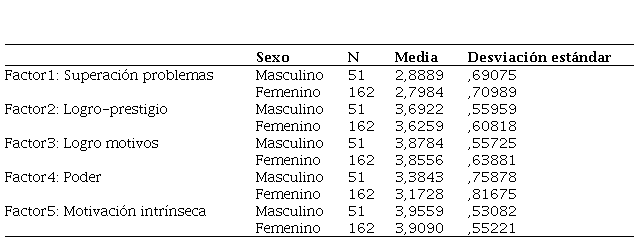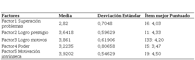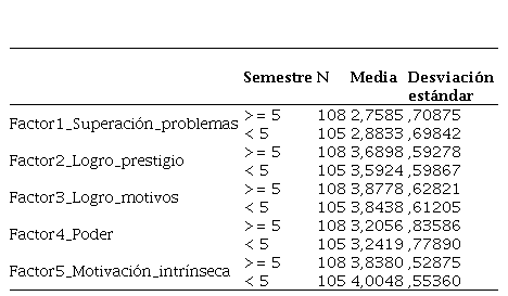 En complemento, se identificó en la tabla 8 de estadísticos descriptivos, que, entre los cinco factores, de acuerdo a los valores medios para el factor 1(superación de problemas afectivos y preocupación por las relaciones personales), es superior en aquellos estudiantes que se encuentran cursando los primeros cuatro semestres (2,88); para el factor 2 (de logro y prestigio) y 3 (logro asociado a motivos afiliativos), son los alumnos de los semestres superiores quienes manifiestan mejor puntuación (3,67 y 3,88, respectivamente); en cambio, en el factor 4 (poder), tiene mayor puntuación en los estudiantes de niveles inferiores.