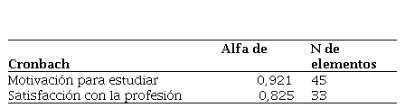 De acuerdo a lo datado en la tabla 1, el nivel de confiabilidad (alfa de Cronbach), del total de ítems de los instrumentos, manifiestan valores de 0,921 y 0,825, respectivamente para el cuestionario de motivación para estudiar psicología (MOPI), y escala de satisfacción con la profesión elegida. Valores que de acuerdo a lo expresado por Bojórquez, López, Hernández y Jiménez (2013), evidencian fuerte relación entre las preguntas y confiabilidad respecto a su consistencia interna.