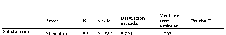Después de haber determinado la consistencia interna de los instrumentos, se puede observar en la tabla 2, la diferencia existente entre el sexo, mediante la prueba T de Student, la cual evidenció un valor de p de 4,9%, que al ubicarse por debajo del umbral máximo de 5%, rechaza hipótesis nula de no existencia de significancia estadística, aceptando, por tanto, que entre el sexo masculino y femenino hay diferencia estadísticamente significativa; siendo el sexo femenino el que manifiesta según el valor de la media (96,23) mayor nivel de satisfacción con la carrera que han decidido estudiar, versus al valor medio del sexo masculino que fue de 94,79. Adicionalmente, se observa que, la dispersión entre los sujetos de sexo masculino es de 5,29 puntos; mientras que para las féminas fue de 4,88. De acuerdo a las puntuaciones, la satisfacción con la carrera elegida para ambos casos es ambivalente (rango de puntaje 85-117, de acuerdo a la escala).