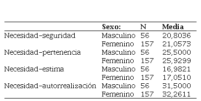 Además, se observa (tabla 3) que, en las diferentes dimensiones que evalúa la escala, el sexo femenino puntúa mejores valores medios que el sexo masculino; denotando de este modo, que las mujeres son quienes mejor satisfacen sus necesidades de seguridad, pertenencia, estima y autorrealización, al estudiar la carrera de psicología.