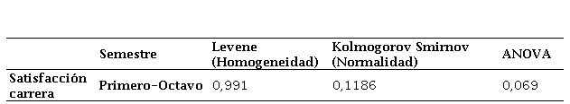 Por otro lado, se procedió a determinar un análisis de varianza (ANOVA), respecto a los niveles de estudio de la carrera. Para darle validez por ser una prueba paramétrica, en primera instancia, se determinaron las pruebas de homogeneidad de varianzas y normalidad, que de acuerdo con lo que se avista en la tabla 4, la prueba de Levene (homogeneidad) presentó un valor del 99,1%; mientras que la prueba de Kolmogorov Smirnov (normalidad) resultó de 11,86%; que al poseer un p-valué cada una por encima del 5%, se aceptan hipótesis nulas de existencia de ambas condiciones.