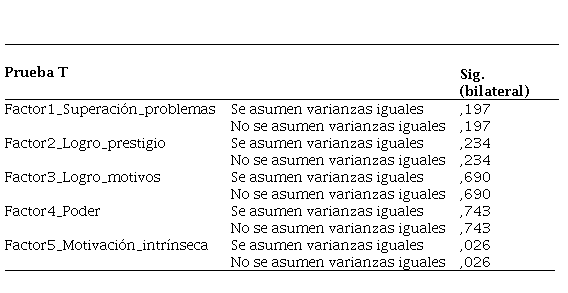 Pese a los resultados descritos en la tabla anterior; se logró determinar con la prueba T de Student (tabla 7), tomando como variable factor a los niveles de educación, divididos entre los niveles inferiores (primero al cuarto semestre), y los niveles superiores (quinto al octavo semestre), que únicamente el factor 5: motivación intrínseca de conocimiento, presenta de acuerdo a la significancia bilateral (2,6%), diferencia estadísticamente significativa, debido a que dicho valor se encuentra por debajo del 5%, aceptando hipótesis alternativa de existencia de diferencia estadísticamente significativa de medias entre los niveles inferiores y superiores.