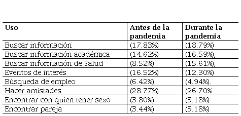 En la tabla 1 se puede observar en porcentajes los usos que se le dieron a las redes antes y durante la pandemia, se puede notar que hubo un aumento para buscar información en temas concernientes a salud, así mismo en búsqueda de información académica, por otra parte, la búsqueda de eventos disminuye, puesto que el confinamiento no dejaba salir a eventos y estos disminuyeron (Cervantes Hernández y Chaparro-Medina, 2021).