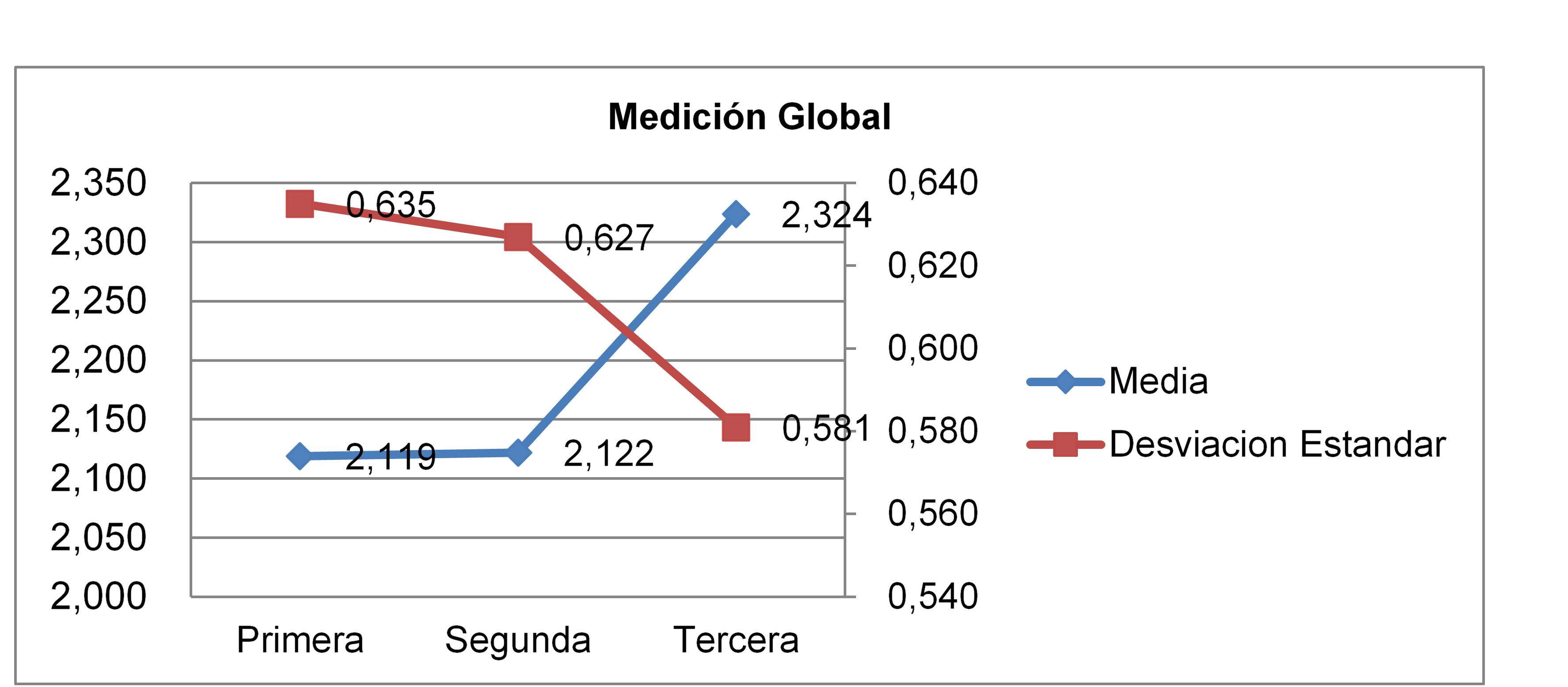 Considerando las tres aplicaciones del instrumento Escala de percepciones sobre la fluidez oral del inglés, se presenta la trayectoria de la media de las respuestas, aceptando que en ninguna respuesta la desviación estándar evidencia una alta dispersión, y esta se mantuvo siempre entre un 0,39 como mínimo y un 0,88 como máximo, adicionalmente la desviación estándar global disminuyó con cada medición, al considerar las tres aplicaciones del instrumento, lo que aporta confiabilidad en las respuestas. Por otra parte, la media global del instrumento incrementó con cada medición, acercándose a la respuestaSiempre, la cual representaba la respuesta ideal en la mayoría de los enunciados. La figura 1 muestra el comportamiento de la media y la desviación estándar en la primera, segunda y tercera medición.