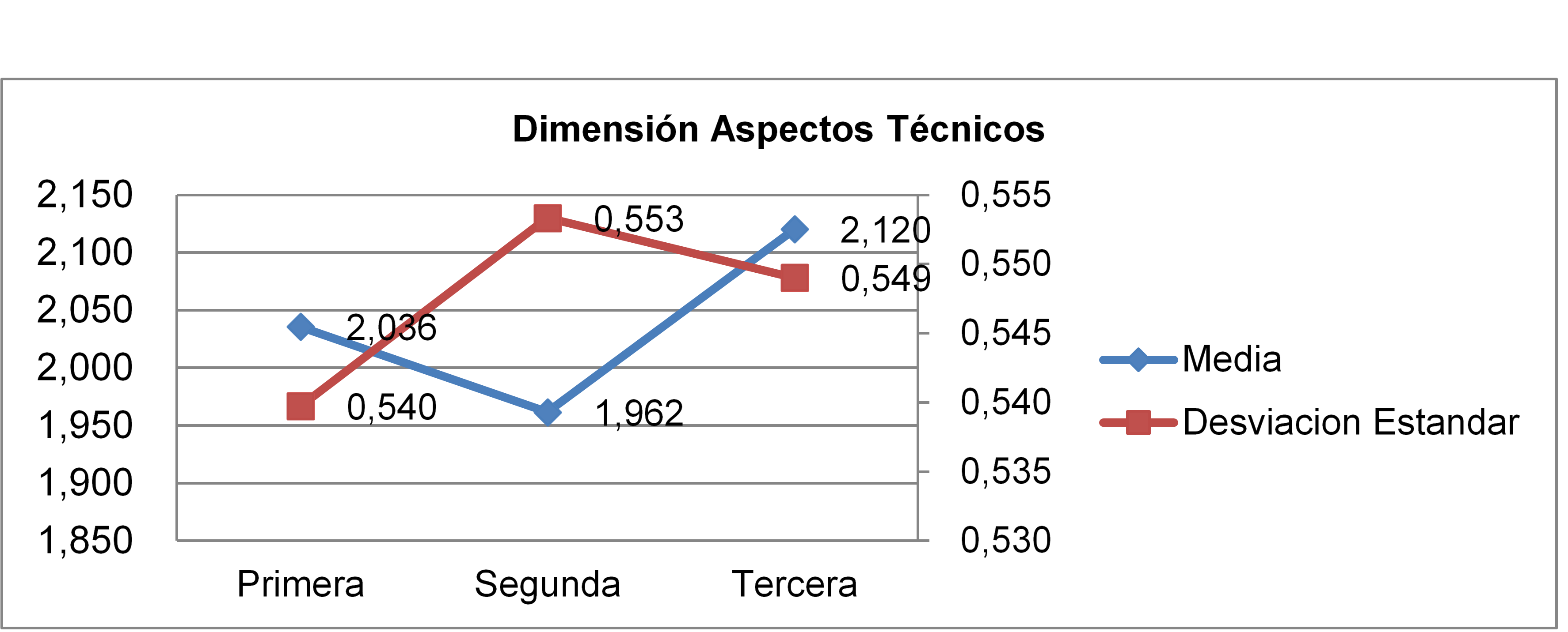 La dimensión de Aspectos Técnicos, que hacía referencia al dominio de distintos aspectos de la fluidez oral por parte de los estudiantes como: la velocidad, uso de pausas, medidas de reparo y marcadores de discurso, presentó resultados variables, estos tuvieron una desmejora en la segunda medición, sin embargo, terminaron con cifras favorables: una media que se ubica en la respuesta A veces, y una desviación estándar controlada, según figura 2.