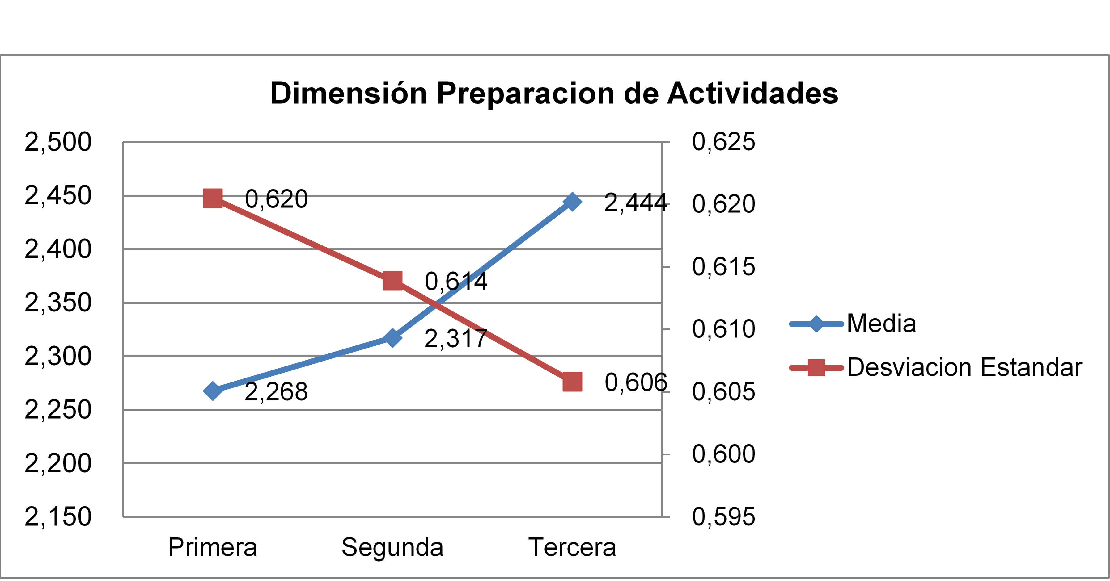 La dimensión de Preparación de Actividades, que hacía referencia a las distintas estrategias que utilizaban los estudiantes frente a una instancia donde tuviesen que expresarse oralmente en inglés como: usar frases formulaicas, practicar lo que se va a decir con anterioridad, recordar las explicaciones del profesor y producir frases libremente; presentó resultados favorables en cada medición, la tendencia de la media fue a incrementar hacia la respuesta Siempre, y la desviación estándar a disminuir con cada aplicación, lo que demuestra un mayor grado de confiabilidad en las respuestas, según la figura 3).