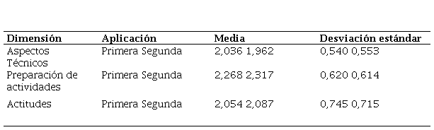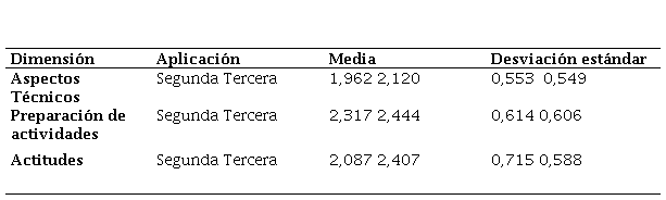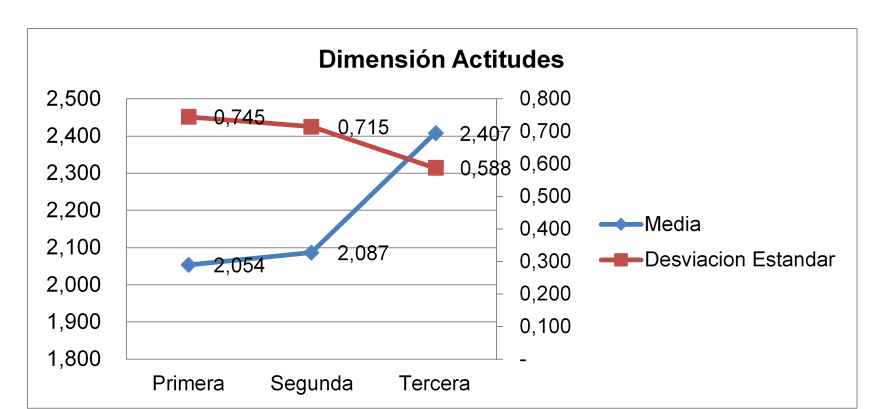 Estos datos permitieron establecer que no hay diferencias en las medias de las respuestas según las distintas dimensiones, estas siguieron en la opción A veces; sin embargo, la desviación estándar en la Dimensión Actitudes se muestra un tanto elevada, lo que indica que las respuestas a esos ítems no fueron uniformes.