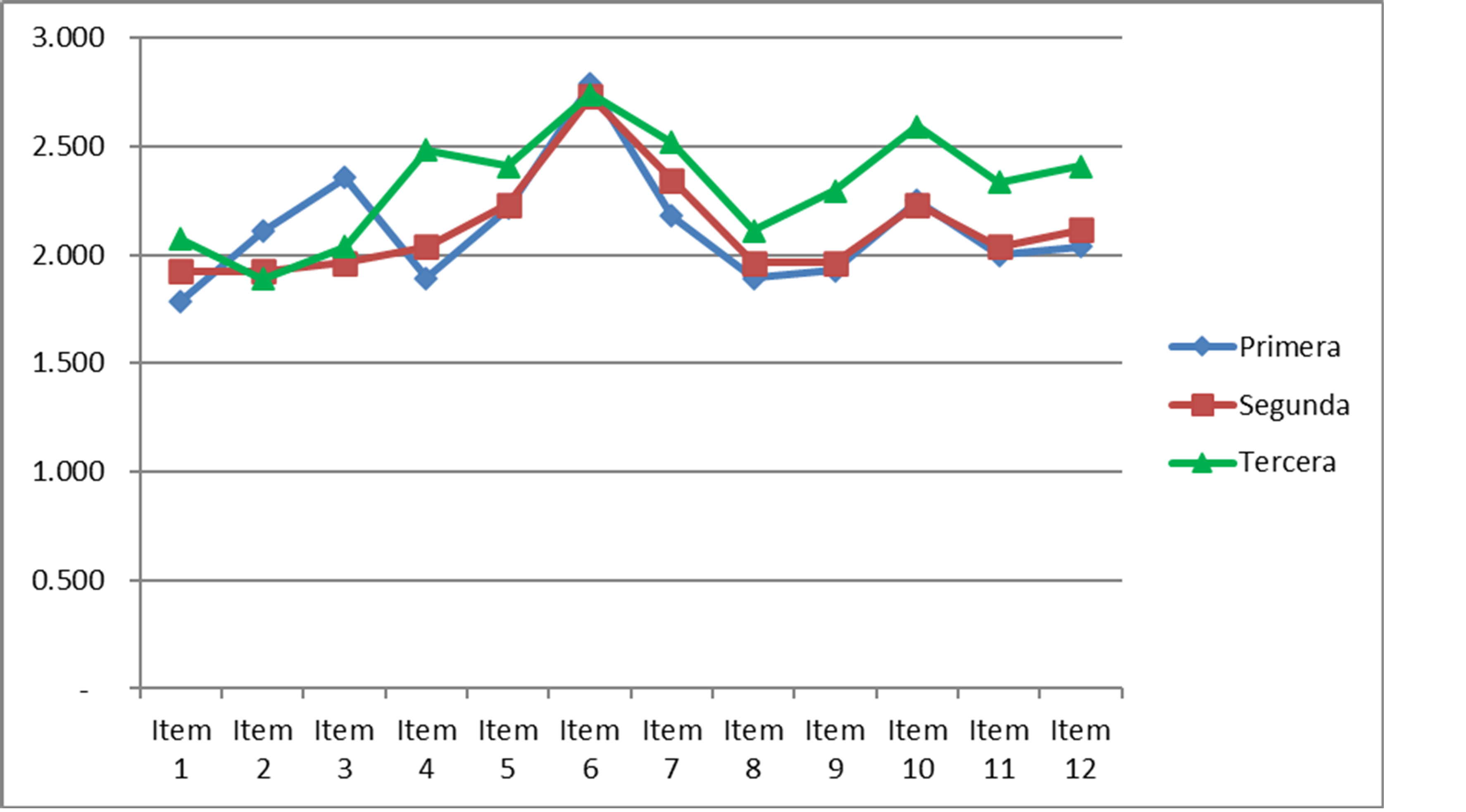 - Los cuatro ítems asociados a la dimensión de actitudes experimentaron el incremento más alto en sus medias en la última medición, lo que representa una significativa mejora en sus percepciones relacionadas con la expresión oral en inglés en distintos contextos sociales. La figura 5 a continuación sintetiza las medias de los doce enunciados del instrumento en sus tres aplicaciones.